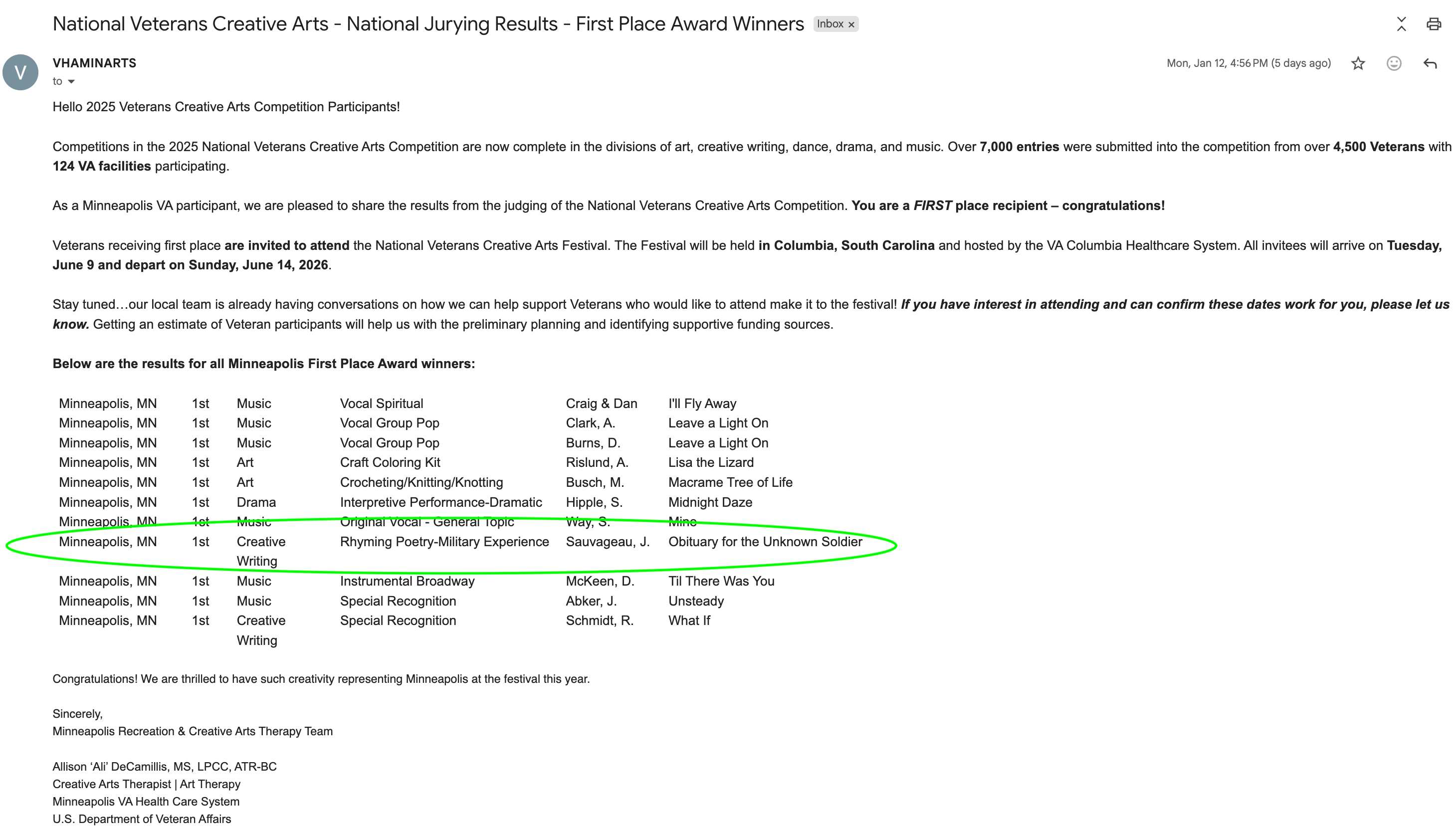But first, a bit of good news. Last summer, I submitted two poems and one short essay to the local Veteran’s Creative Arts Competition. In September, I was notified that each piece I entered received a top-3 status in its respective category, and would therefore be sent on to the national competition. Then, this week I received an email congratulating me on a first place award for one of my poems, and an invitation to attend the National Veterans Creative Arts Festival in Columbia, South Carolina! With all the terrible news coming from our city this week, it was a nice surprise, and helped me focus on something positive for a little while.