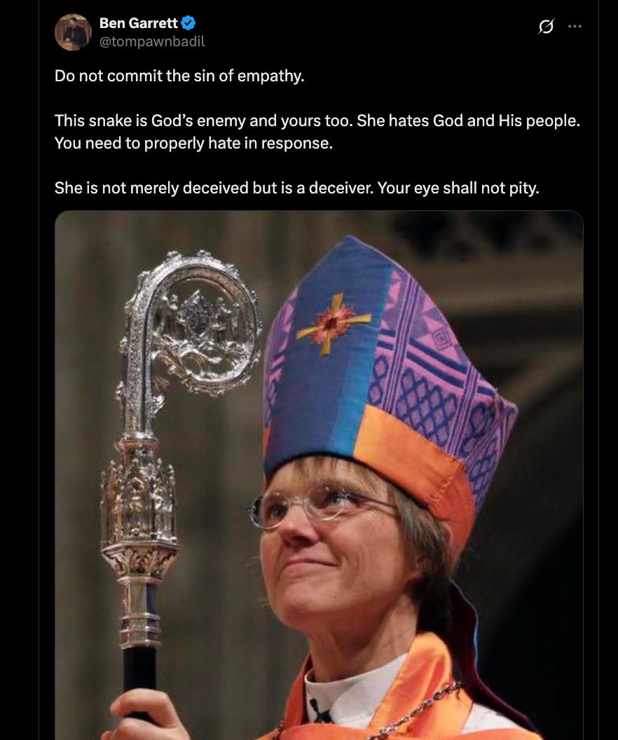 Ben Garrett’s Twitter bio describes him as a “Christian husband and father. Pastor at Refuge Church in Ogden, UT.” Garrett posted this picture of Bishop Mariann Budde—the religious leader who confronted President Donald Trump in her sermon at the Washington National Cathedral on January 21, 2025: